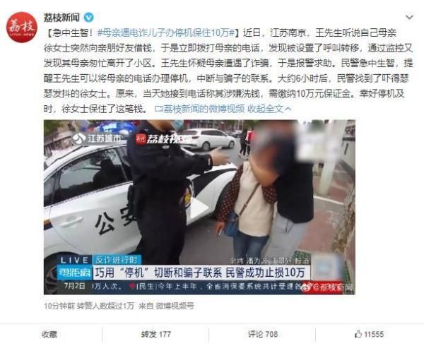 首页 急中生智!母亲遇电信诈骗,儿子办停机保住10万 2022-07-04 09:08:54 分享 近日,江苏南京,王先生听说自己母亲徐女士突然向亲朋好友借钱,于是立即拨打母亲的电话,发现被设置了呼叫转移,通过监控又发现其母亲匆忙离开了小 区。王先生怀疑母亲遭遇了诈骗,于是报警求助。民警急中生智,提醒王先生可以将母亲的电话办理停机,中断与骗子的联系。大约6小时后,民警找到了吓得瑟瑟 发抖的徐女士。原来,当天她接到电话称其涉嫌洗钱,需缴纳10万元保证金。幸好停机及时,徐女士保住了这笔钱。微博截图