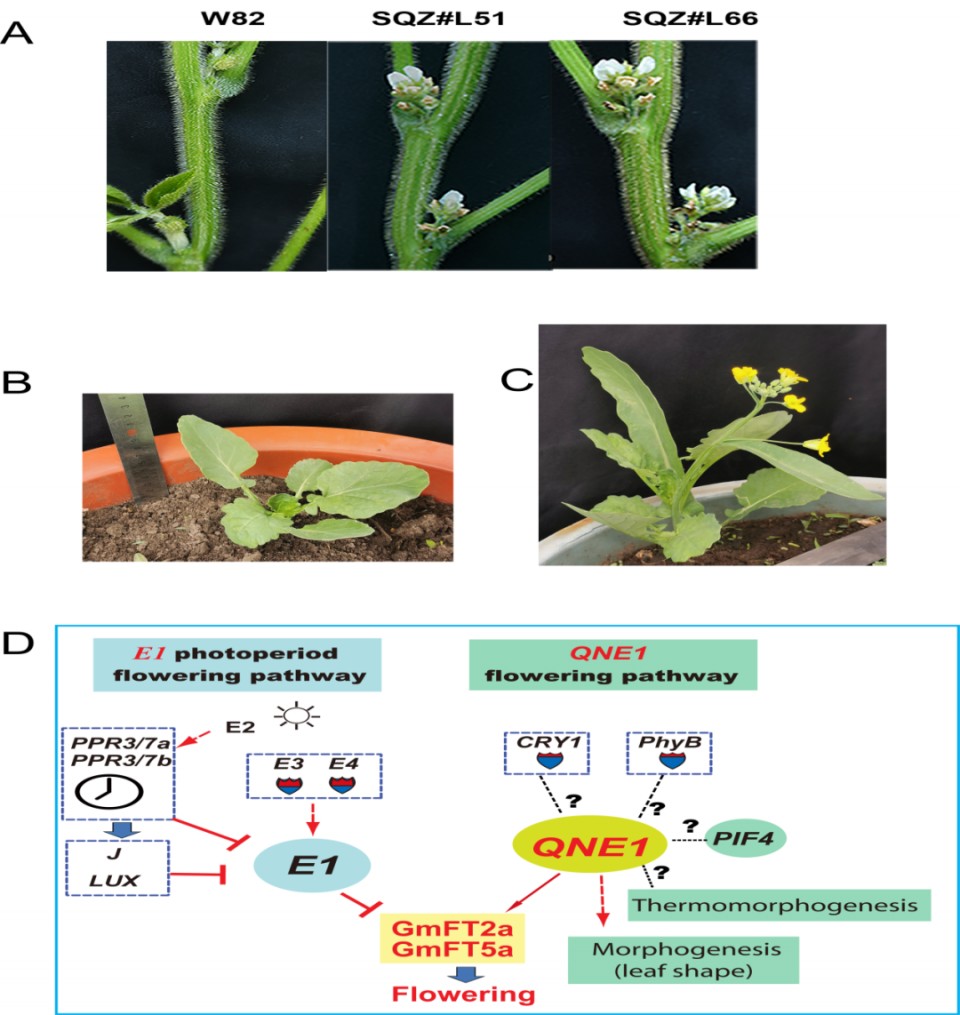 近日,中科院东北地理与农业生态研究所大豆分子设计育种实验室夏正俊研究员团队与中科院遗传所田志喜研究员合作,成功克隆了一个调控大豆营养生长期长度的新型基因QNE1,该基因编码TCP类转录因子,其作用方式与已有的光周期调控开花通路完全不同,丰富了大豆开花调控的调控机制。相关研究成果在线发表于《中国生命科学》。
