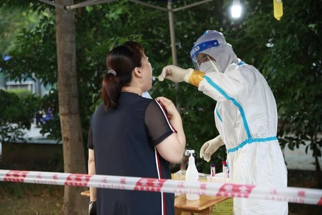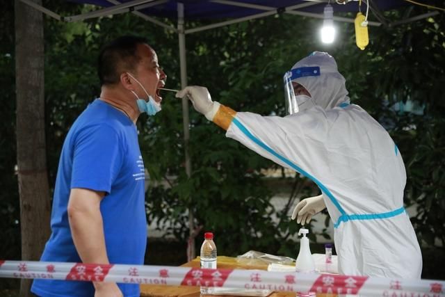 2022年7月7日,西安,灞桥区一小区内,居民在进行核酸检测。当日是西安全市实行7天临时性管控措施的第二天。西安市继续开展核酸筛查工作,统一发放秦始皇“嬴政”卡通形象的核酸采样标识贴纸。