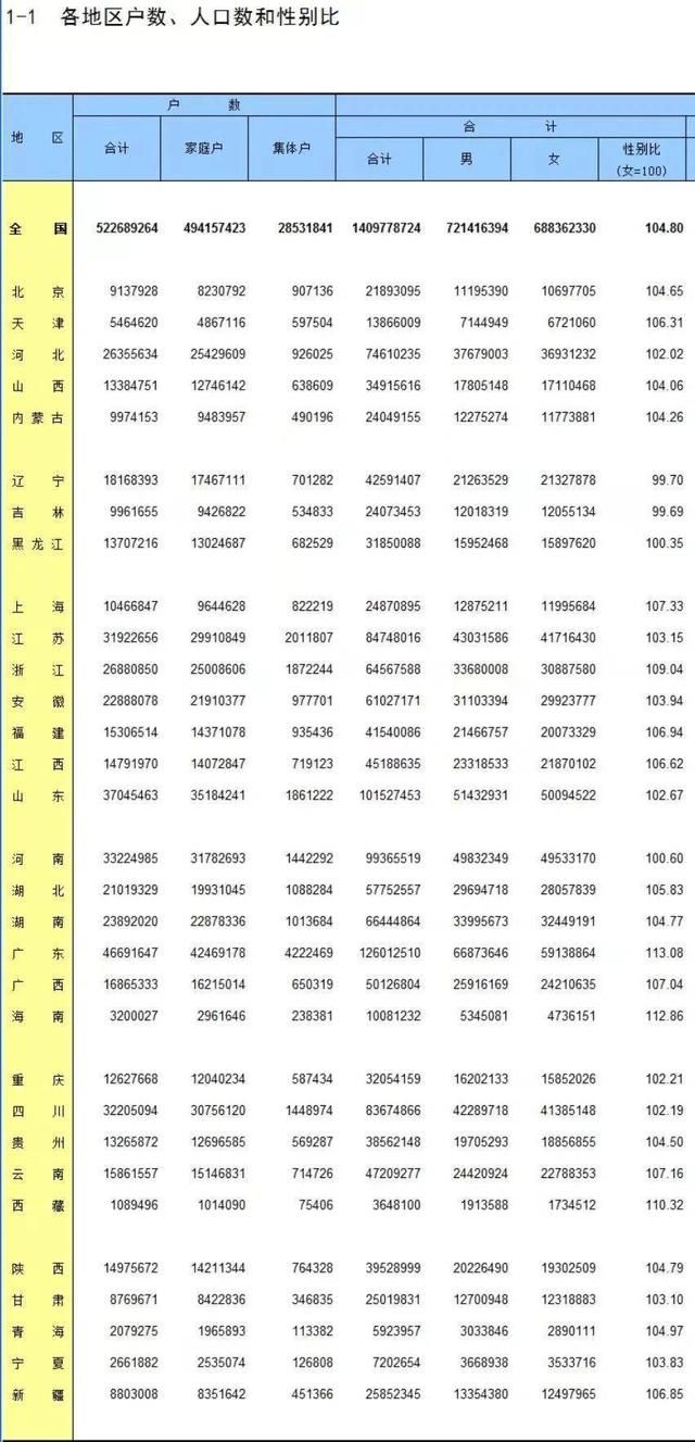 具体数据显示,广东男性人口为66873646人,女性人口为59138864人,男比女多约773万人。