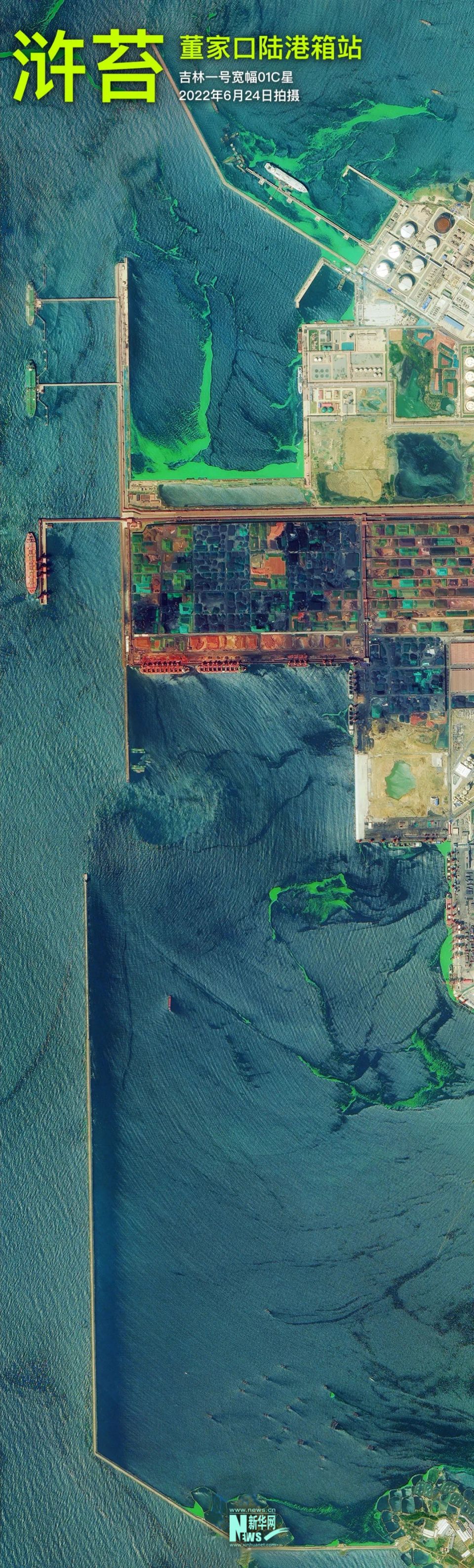 ▲在青岛董家口港站附近,浒苔沿着码头边缘蔓延至各个角落。制图:长光卫星