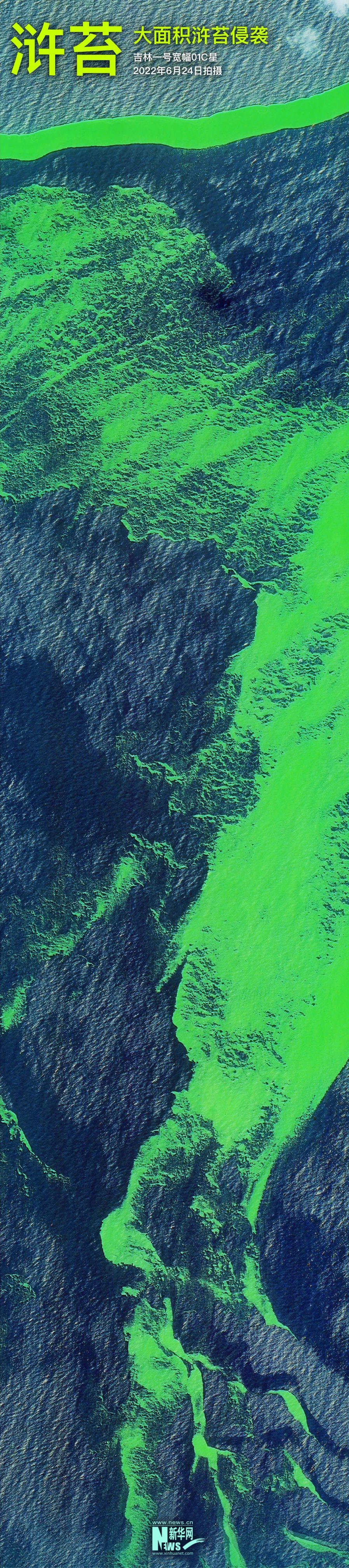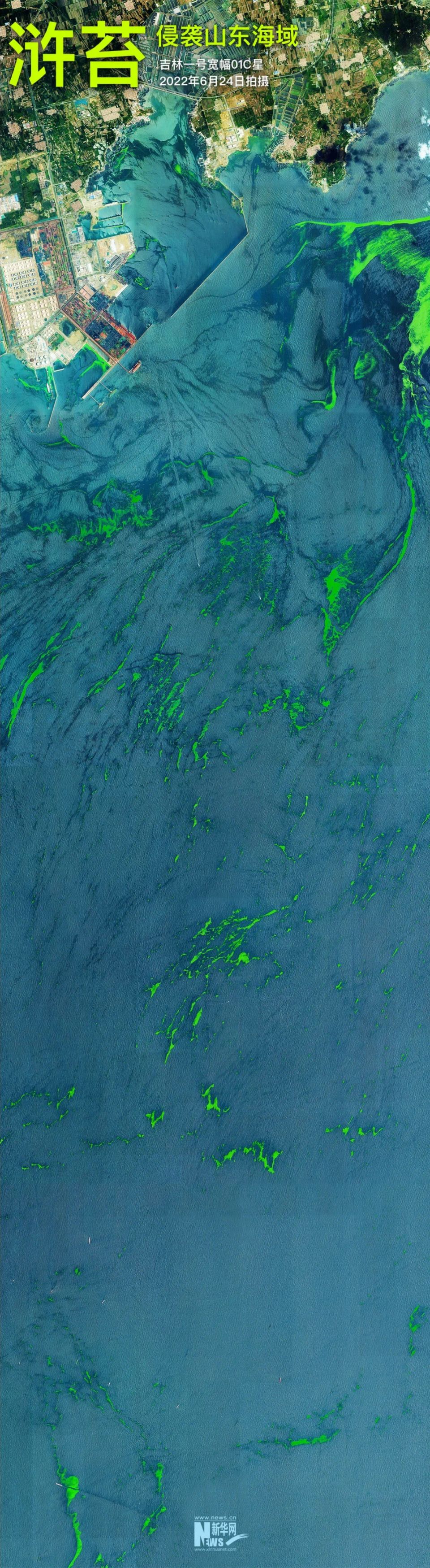 ▲浒苔随着海水流动交织成片,覆盖在海面上。制图:长光卫星
