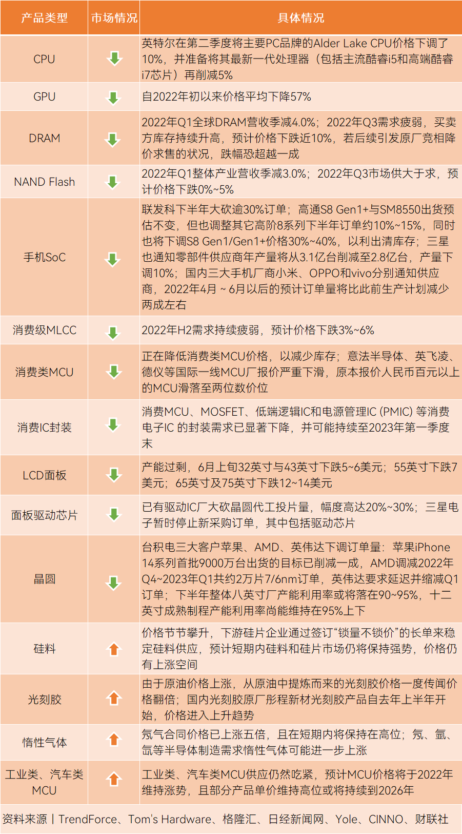 通过汇总各类产品来看,砍单基本发生在消费电子领域,而工业、车规、云服务器产品以及上游材料反而呈现上涨的趋势。