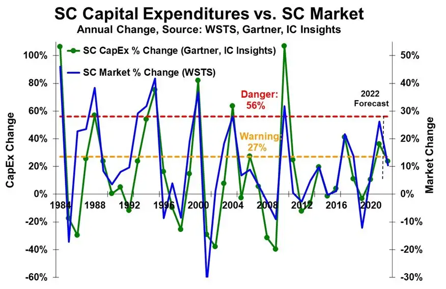 产能过剩对半导体市场影响几何?SemiWiki通过分析1984年~2017年间历史数据得出结论,当半导体资本支出增长超过27%时就需引起警惕,当半导体资本支出增长超过56%时就有面临市场大缩水的风险。