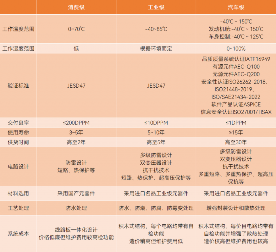 消费、工业、汽车级芯片评估指标对比,制表丨果壳硬科技