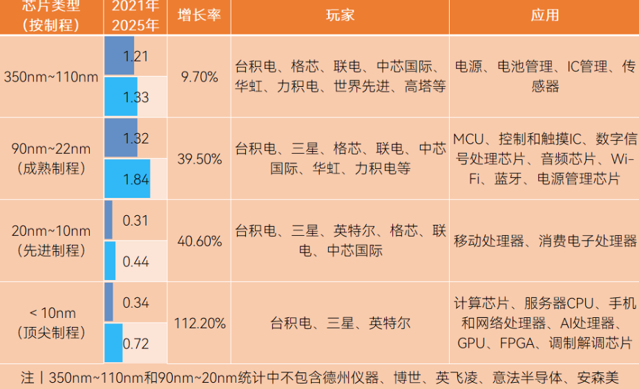 不同制程的芯片类型应用和增长情况,制表丨果壳硬科技
