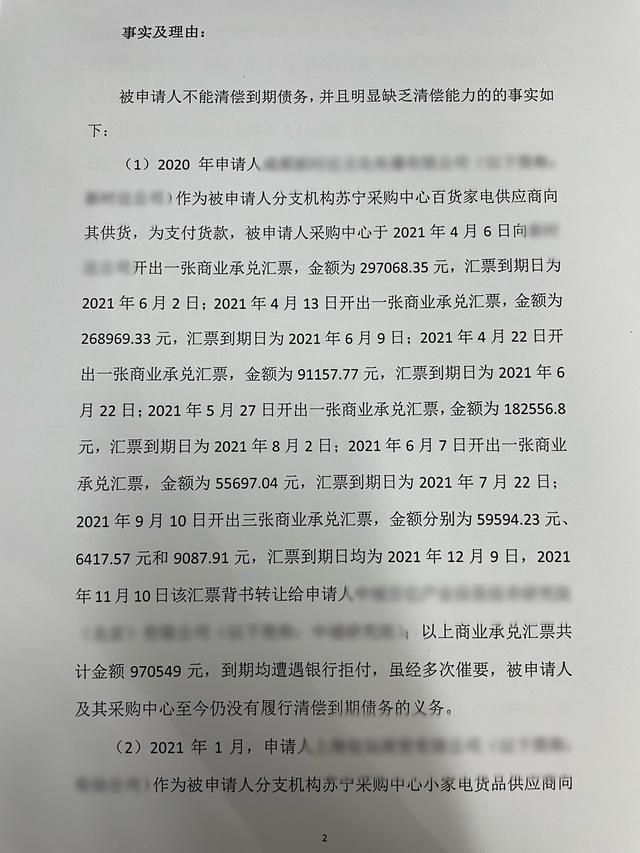 以供应商A为例,破产清算申请书显示,该供应商在2020年向苏宁易购供货,苏宁易购的采购中心前后共开出8张商业承兑汇票,共约97万元。这些商业承兑汇票到期均遭银行拒付,经多次催要,苏宁易购及其采购中心至今仍未履行清偿到期债务的义务。