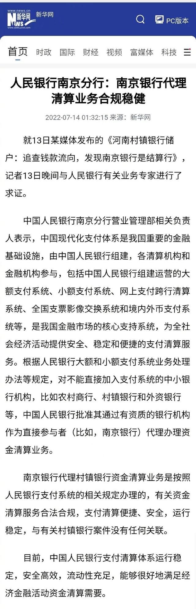 南京银行代理村镇银行资金清算业务是按照人民银行支付系统的相关规定办理的,有关资金清算服务合法合规,支付清算便捷、安全,运行稳定,与有关村镇银行案件没有任何关联。