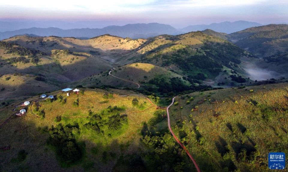 首页 神奇瑰丽的巴山大草原 2022-07-15 09:04:32 分享 7月14日,朝霞照耀着巴山大草原(无人机照片)。盛夏时节,陕西省安康市岚皋县巴山大草原野花遍地,风光旖旎,吸引众多游客到此露营度夏休闲。近年来,当地政府依托巴山大草原高品质草原观光、帐篷露营等多样化旅游产品,提升旅游品牌,实现旅游产业跨越式发展。新华社记者 陶明 摄