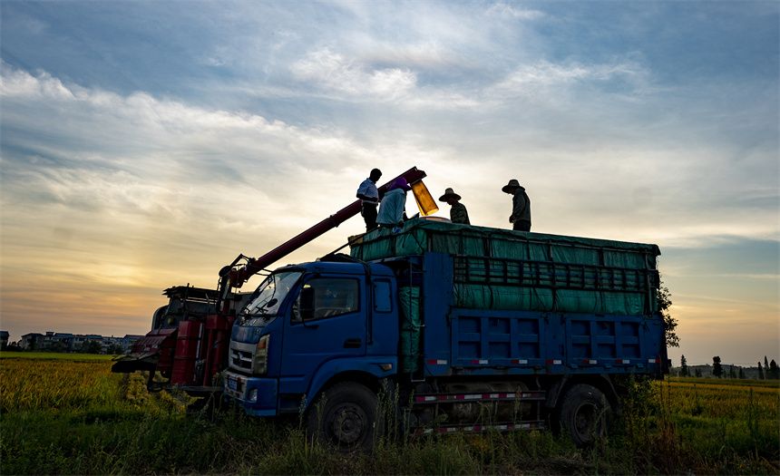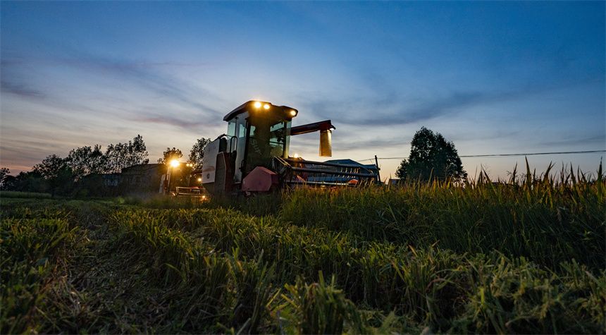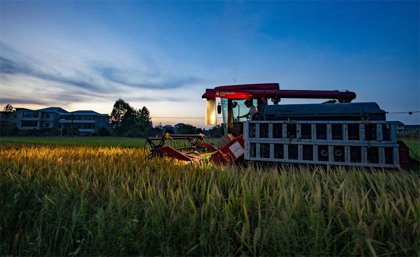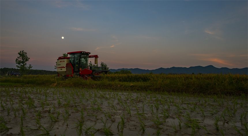 人民网南昌7月15日电 近日,江西省新余市南安乡东洛村,农机手跨区作业昼夜抢收早稻。“双抢”时节,江西省新余市54.8万亩早稻相继进入收割期,晚稻育秧有序进行。