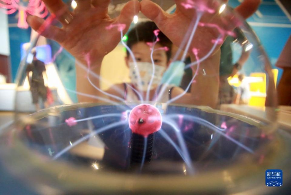 7月17日,小朋友在江苏扬州科技馆内体验“辉光球”。