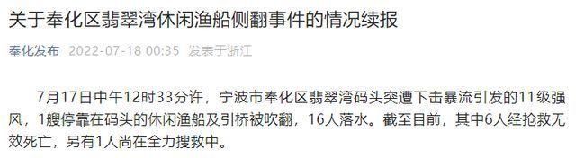 首页 已致6人死亡!浙江宁波一休闲渔船被11级强风吹翻 2022-07-18 09:11:40 分享 7月17日中午12时33分许,宁波市奉化区翡翠湾码头突遭下击暴流引发的11级强风,1艘停靠在码头的休闲渔船及引桥被吹翻,16人落水。截至目前,其中6人经抢救无效死亡,另有1人尚在全力搜救中。来源:北京日报客户端原标题:浙江宁波一休闲渔船被11级强风吹翻,已致6人死亡