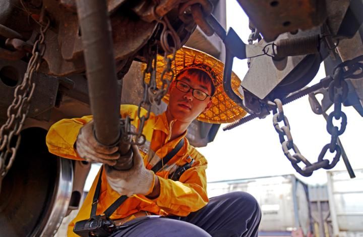 安全带、草帽、手套是调车人员工作的标配,他们的工作是在列车开行前将分门别类的车厢调到正确的货运线上编组成列,再逐一检查确认车厢制动系统的状态,他们始终要扒在车外,观测距离,控制车速,所以被人们形象地称他们为“火车编程师”。
