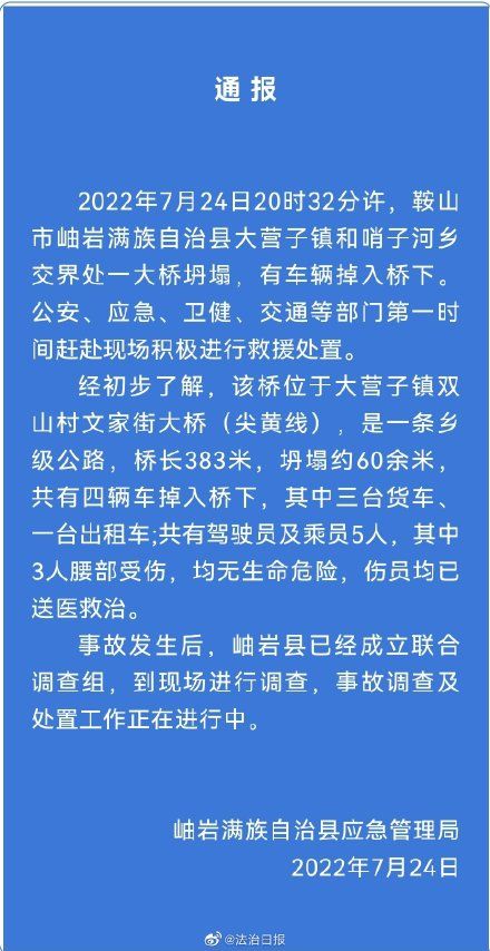 2022 年7月24日20时32分许,鞍山市岫岩满族自治县大营子镇和哨子河乡交界处一大桥坍塌,有车辆掉入桥下。公安、应急、卫健、交通等部门第一时间赶赴现场 积极进行救援处置。经初步了解,该桥位于大营子镇双山村文家街大桥(尖黄线),是一条乡级公路,桥长383米,坍塌约60余米,共有四辆车掉入桥下,其中 三台货车、一台出租车;共有驾驶员及乘员5人,其中3人腰部受伤,均无生命危险,伤员均已送医救治。事故发生后,岫岩满族自治县已经成立联合调查组,到现 场进行调查,事故调查及处置工作正在进行中。(全媒体记者 韩宇)