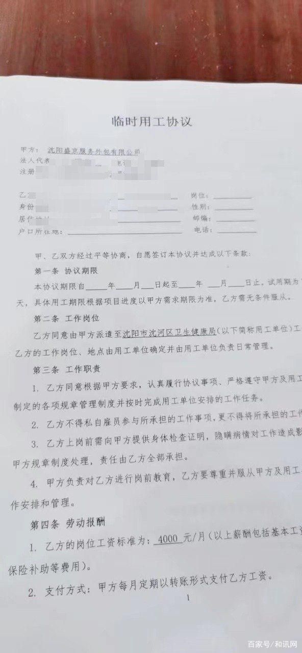 张涵提供的临时用工协议中显示,乙方同意由甲方派遣至沈阳市沈河区卫生健康局工作,乙方的工作岗位、地点由用工单位确定并由用工单位负责日常管理。同时,该份临时用工协议中也明确规定岗位工资标准为4000元一月,甲方每月的15日,以转账形式支付乙方工资。