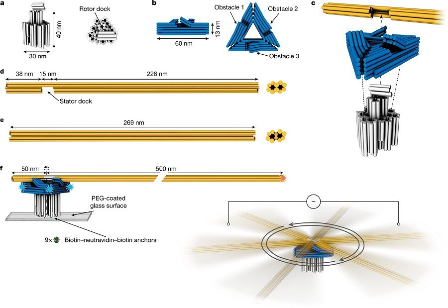 a、b:基座和三角形平台示意图,圆柱体表示DNA双螺旋。c:马达装配步骤。d、e:转子臂组件。f:微型马达动力学实验装置(左);接上电极产生旋转(右)。