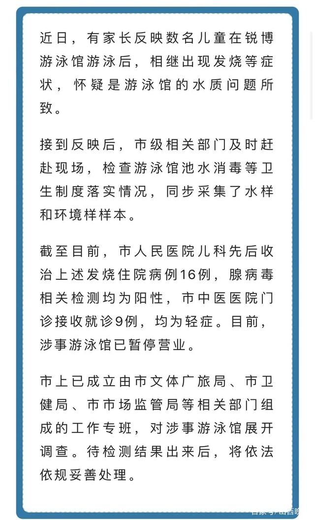 7月21日晚上11点,什邡市发布情况通报称,近日,接到数名家长反映儿童在锐博游泳馆游泳后出现发烧等症状,怀疑是游泳馆水质问题所致。已成立调查组进行调查。截至目前,市人民医院儿科先后收治发烧住院病例16例,腺病毒相关检测均为阳性,市中医院门诊接受就诊9例,均为轻症。目前,涉事游泳馆已停止营业。