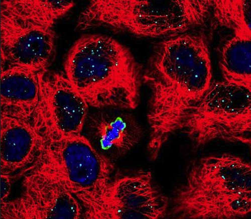 分裂细胞中的染色体分离。细胞骨架用红色描绘,DNA用蓝色描绘,标记分裂细胞的蛋白质用绿色描绘。图片来源:本·戴维实验室/特拉维夫大学