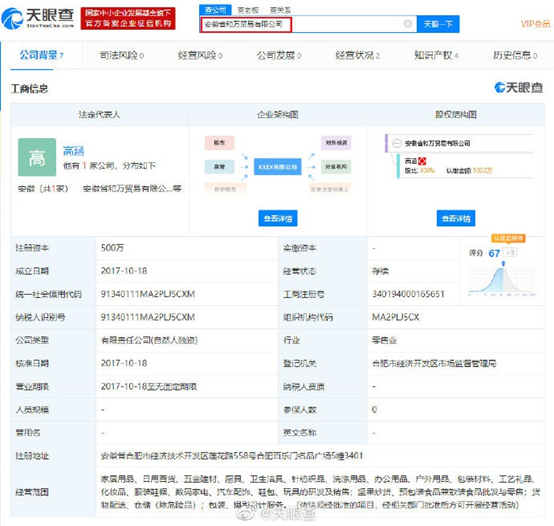 天眼查信息显示,“路人A-”旗下有一家公司,名为安徽省和万贸易有限公司,注册资金500万,成立时间2017年;他的天猫店铺为路人A的小站。目前“路人A-”带粉丝薅垮店铺一事还在进一步处理中。