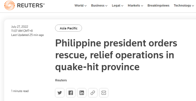 外媒:菲律宾总统马科斯下令派遣救援队,他将前往地震震中阿布拉省