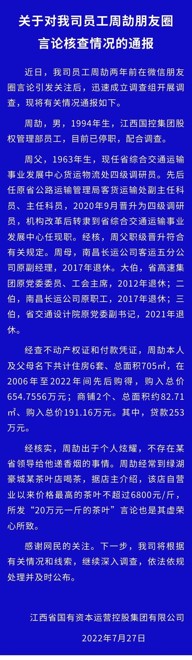 周劼,男,1994年生,江西国控集团股权管理部员工,目前已停职,配合调查。