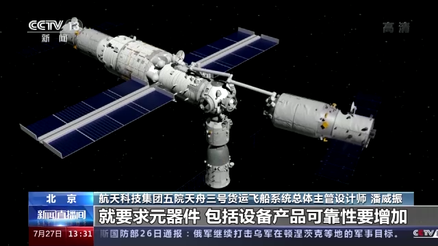 航天科技集团五院天舟三号货运飞船系统总体主管设计师 潘威振:因为太空环境有一定的辐射,还有各种干扰。停靠时间长,就要求元器件,包括设备产品可靠性要增加。