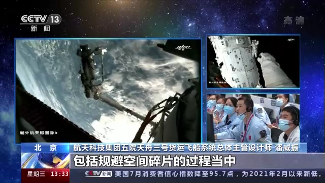 航天科技集团五院天舟三号货运飞船系统总体主管设计师 潘威振:调整姿态,相当于从一个方向调到另一个方向,这时候也需要发动机来提供动力。包括规避空间碎片的过程当中,也需要用发动机进行轨道的控制。
