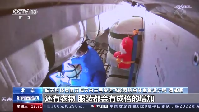航天科技集团五院天舟三号货运飞船系统总体主管设计师 潘威振:天舟三号也是首次验证了长期驻留的支持能力。因为它停留时间长,包括食品,然后生活物资,还有衣物、服装都会有成倍的增加,另外它还要提供存储的空间,包括备用设备以及废弃物这些存储空间的支持。