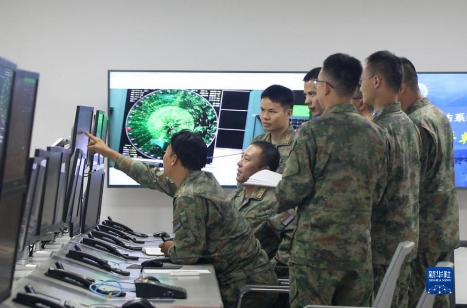 海军某试验训练区官兵共同研判电磁干扰效果(2022年7月16日,视频截图)。新华社发(贺加 摄)