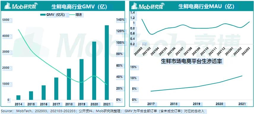 最新行业研究数据表明,2022年生鲜电商的GMV超过4000亿元,涌现出每日优鲜、叮咚买菜、多多买菜、美团优选等生鲜电商巨头,但因其市场竞争激烈,现阶段已经增速平缓。月活保持在1亿左右,随着疫情的反复出现波动。目前生鲜购买场以传统菜市场为主,生鲜平台渗透率待提升。