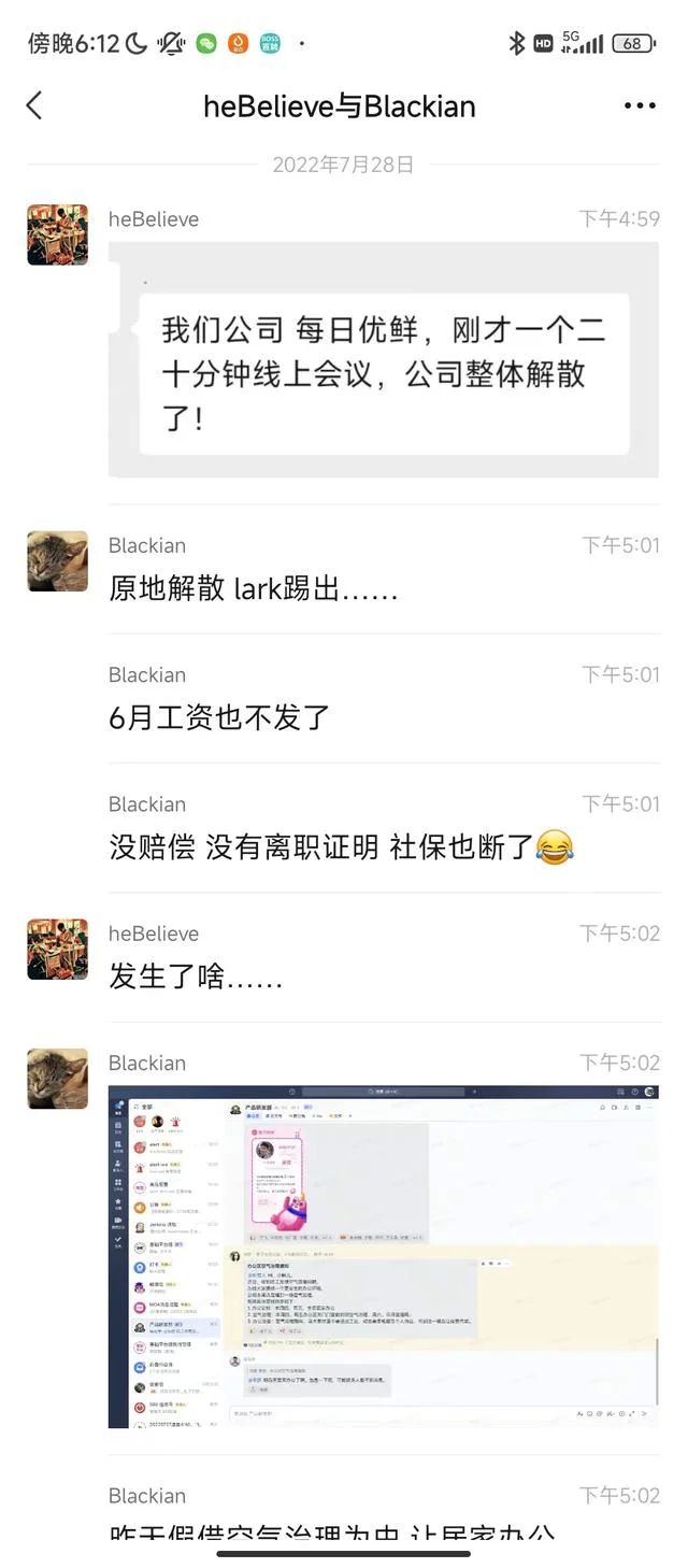 此外,有网友在社交媒体曝料每日优鲜在28日下午开完会后宣布原地解散,同时员工没有收到离职赔偿以及工资,并有会议录音为证,群聊天截图更是加重了这一猜疑。