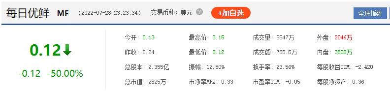 截止7月28日盘中,每日优鲜股价暴跌50%,仅剩下0.12美元/股。以2021年6月25日上市的发行价13美元/股计算,市值蒸发了99%。