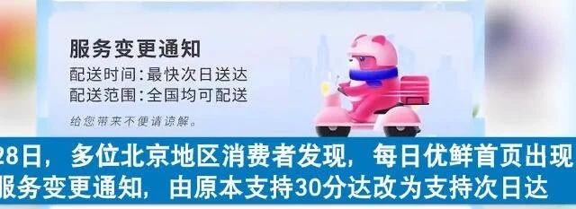 在面临退市风险之际,每日优鲜被迫对业务实施变更。其实早在多日前,就有消费者发现,每日优鲜已经再APP上显示了服务变更的信息,由原来的30分钟变成了次日送达。这或许是本次事件的前兆。