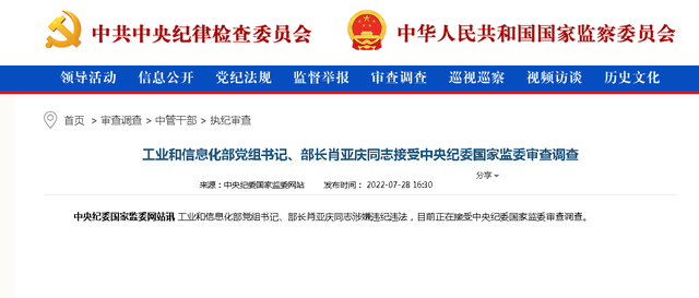 7月28日下午,中央纪委国家监委网站发布消息,工业和信息化部党组书记、部长肖亚庆同志涉嫌违纪违法,目前正在接受中央纪委国家监委审查调查,63岁的肖亚庆成为今年首位“落马”的现任部长。