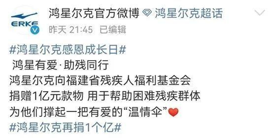 7月30日晚,@鸿星尔克官方微博 发布消息称,鸿星尔克向福建省残疾人福利基金会捐赠1亿元款物,用于帮助困难残疾群体。