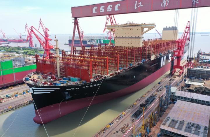 人民网上海8月1日电 (葛俊俊)8月1日,中国船舶集团旗下沪东中华建造的24116箱超大型集装箱船在长兴造船基地顺利出坞。这是迄今为止全球建造的首艘最大装箱量集装箱船,标志着世界超大型集装箱船建造进入中国船舶引领的新纪元。