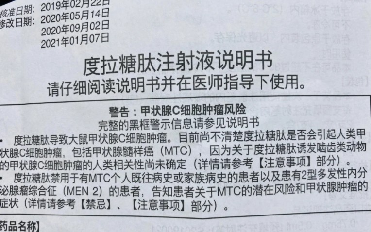 是药就有用药风险。度拉糖肽注射液说明书开头就用黑框提示「警告:甲状腺 C 细胞肿瘤风险」。度拉糖肽导致大鼠甲状腺 C 细胞肿瘤。目前尚不清楚度拉糖肽是否会引起人类甲状腺 C 类细胞肿瘤,包括甲状腺髓样癌(MTC),因为关于度拉糖肽诱发啮齿类动物的甲状腺 C 细胞肿瘤的人类相关性尚未确定。