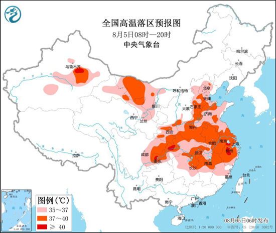 今天(8 月5日),受热带低值系统影响,华南沿海仍有较强降雨,高温暂时缓解。但在江南中北部、江淮至华北一带,大范围高温将继续,多地炎热程度甚至升 级,37~40℃范围或北扩至河南、河北南部等地,公众需加强防暑措施,减少户外停留时间,警惕热射病的发生,及时补水降温。