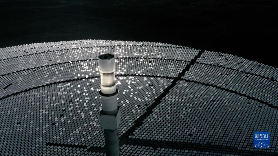 这是位于青海省海南藏族自治州共和县光伏产业园内一处塔式光热发电项目(2021年3月3日摄,无人机照片)。新华社记者 张宏祥 摄