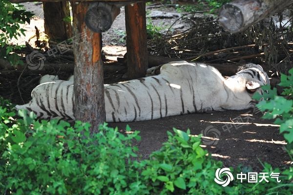 近日北京持续闷热,动物园的动物们纷纷“躺平”。(图/中国天气网 王晓)