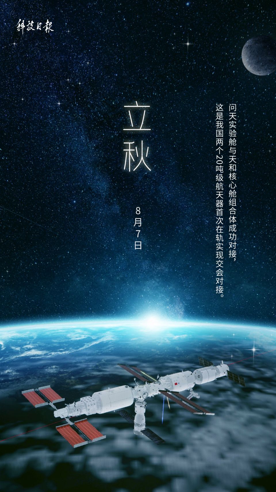 从 2021年4月中国空间站天和核心舱进入太空后,天和不断迎来新访客。随着问天实验舱的交会对接,天和终于迎来的第一位“长期”伙伴。7月25日3时13 分,问天实验舱成功对接于天和核心舱前向端口。这是我国两个20吨级航天器首次在轨实现交会对接。“问天”之后,“梦天”也将很快起飞。神舟十四号飞行任 务期间将全面完成以天和核心舱、问天实验舱和梦天实验舱为基本构型的天宫空间站建造,建成国家太空实验室。期待中国航天继续上演“宇宙级精彩”!