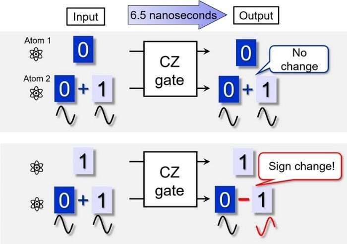 量子门的操作。当原子1处于“0”状态时,什么也没有发生(上)。当原子1处于“1”状态时,原子2的叠加符号由正变为负。此操作是在量子计算机上运行的量子算法的核心(下)。