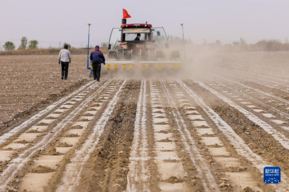在新疆生产建设兵团第六师共青团农场的棉田里,职工操作搭载北斗导航系统的播种机进行春播(2022年4月19日摄)。新华社记者 丁磊 摄