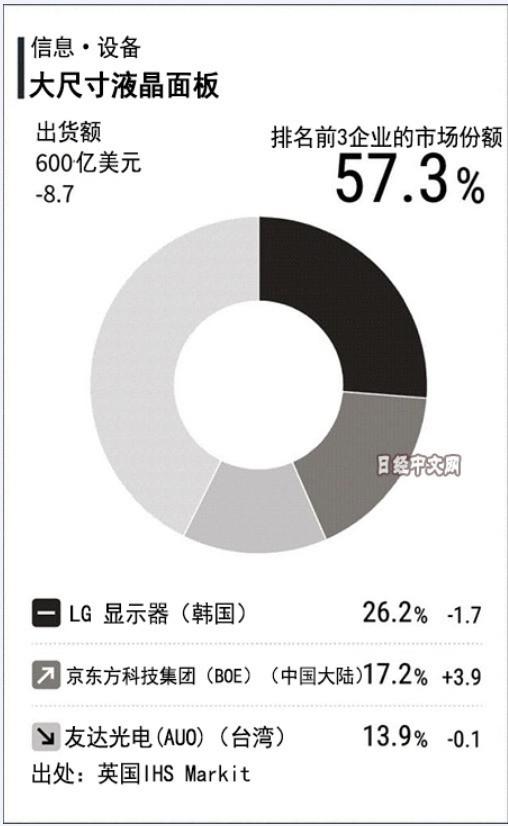 汇总的2018年“全球主要商品与服务市场份额调查”显示,在过去日韩台厂商占主要地位的液晶面板市场上,中国大陆企业持续加强攻势。平板电视等使用的大尺寸面板方面,位居全球第2的中国京东方科技集团(BOE)与首位韩国LG显示器之间的差距缩小。2017年底,京东方在安徽省合肥市投产玻璃基板尺寸达到全球最大的“10.5代”工厂。调查公司IHS Markit的高级总监早濑宏指出“(京东方)在顺利地扩大产能”。