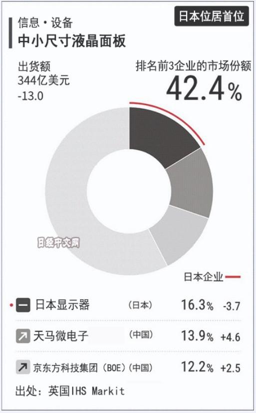 日本显示器(JDI)的虽然在中小尺寸面板的份额方面维持了世界第一的宝座,但由于苹果减少订货,陷入经营危机,面临的状况十分严峻。