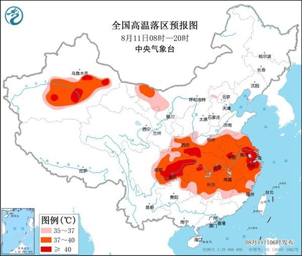 中央气象 台8月11日06时继续发布高温橙色预警:预计8月11日白天,新疆南疆盆地、内蒙古西部、陕西中南部、河南中南部、安徽、江苏、上海、四川中东部、重 庆、湖北、湖南、江西、浙江、福建中北部、贵州北部等地有35~39℃高温天气,其中,陕西东南部、湖北西部和南部、四川东部、重庆、江苏南部、安徽中 部、浙江北部等地的部分地区可达40℃以上。
