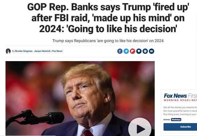 中新网8月11日电 据美国福克斯新闻网报道,在美国联邦调查局(FBI)突查海湖庄园一天后,美国共和党议员班克斯(Jim Banks)于当地时间9日晚会见了美国前总统特朗普。就2024年总统大选,班克斯称特朗普“已经下定决心”。