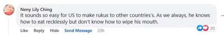 菲律宾网友内尼说:“美国轻易就给其他国家制造混乱,吃相难看,却不知道擦干净嘴巴。”
