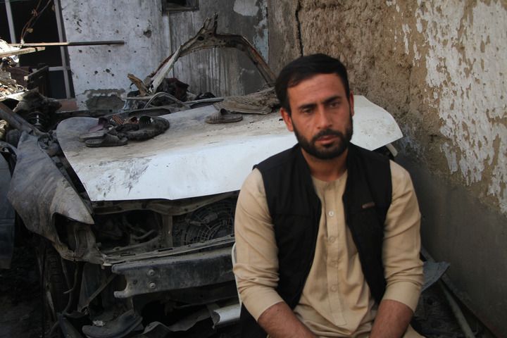 2021年9月18日,在8月29日被美军无人机袭击的阿富汗喀布尔居民区,遇难者扎玛赖的弟弟哈米迪坐在汽车残骸前。新华社发(塞夫拉赫曼·萨菲摄)