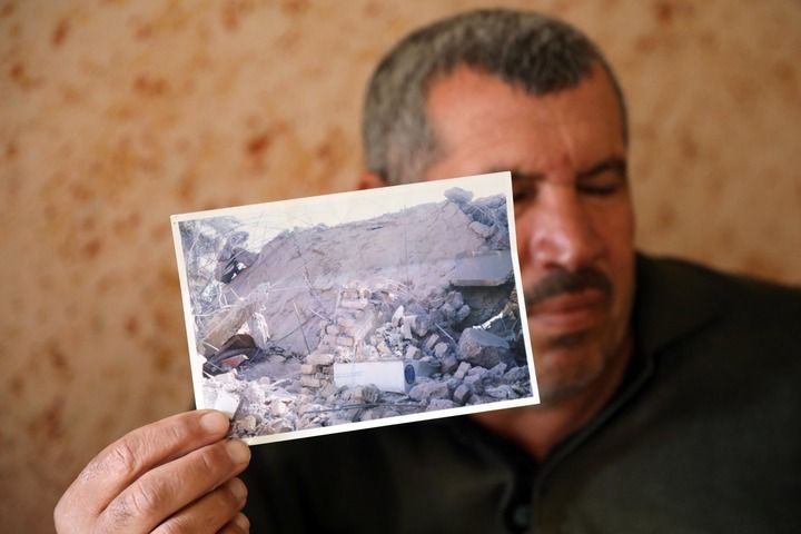 1月4日,在伊拉克萨拉赫丁省,易卜拉欣展示自家房屋炸毁的照片。2005年12月,美军发射的导弹击中了易卜拉欣的家,包括他的妻子和年仅12岁的女儿在内的3名平民死亡,12人受伤。易卜拉欣本人终身瘫痪。新华社发
